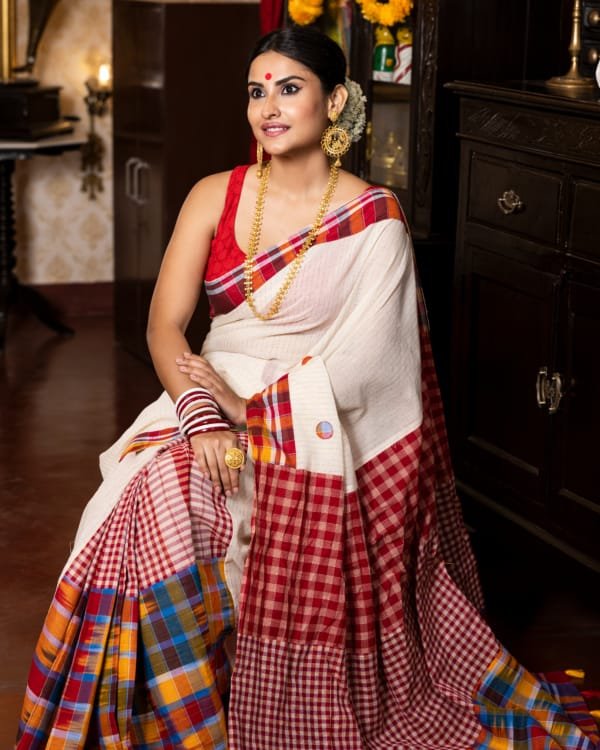 red-gujrati-embroidery-on-checks-white-cotton-sareeNakshipar's Red Gujrati Embroidery on Checks White Cotton Saree