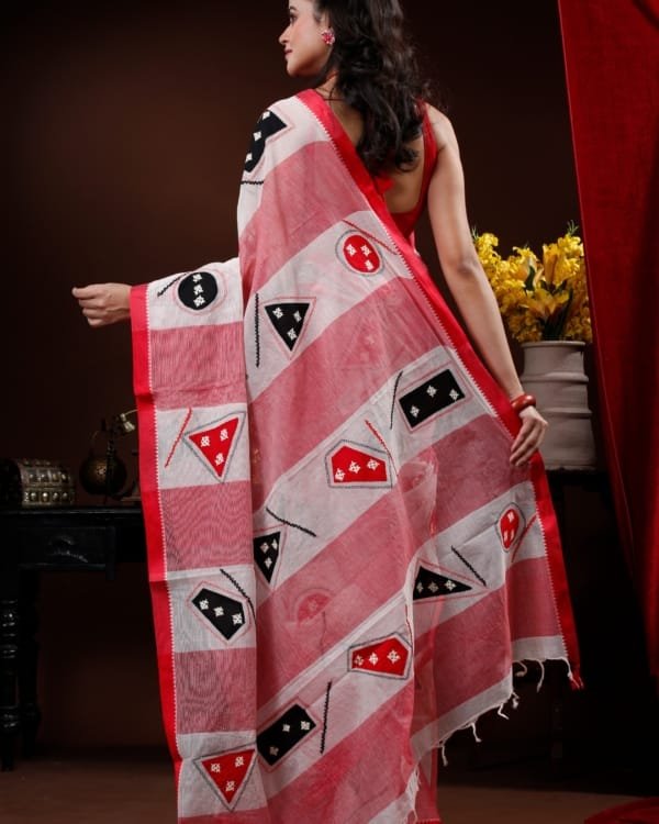 handpaint-in-red-and-black-on-off-white-resham-kota-sareeNakshipar Cotton Saree