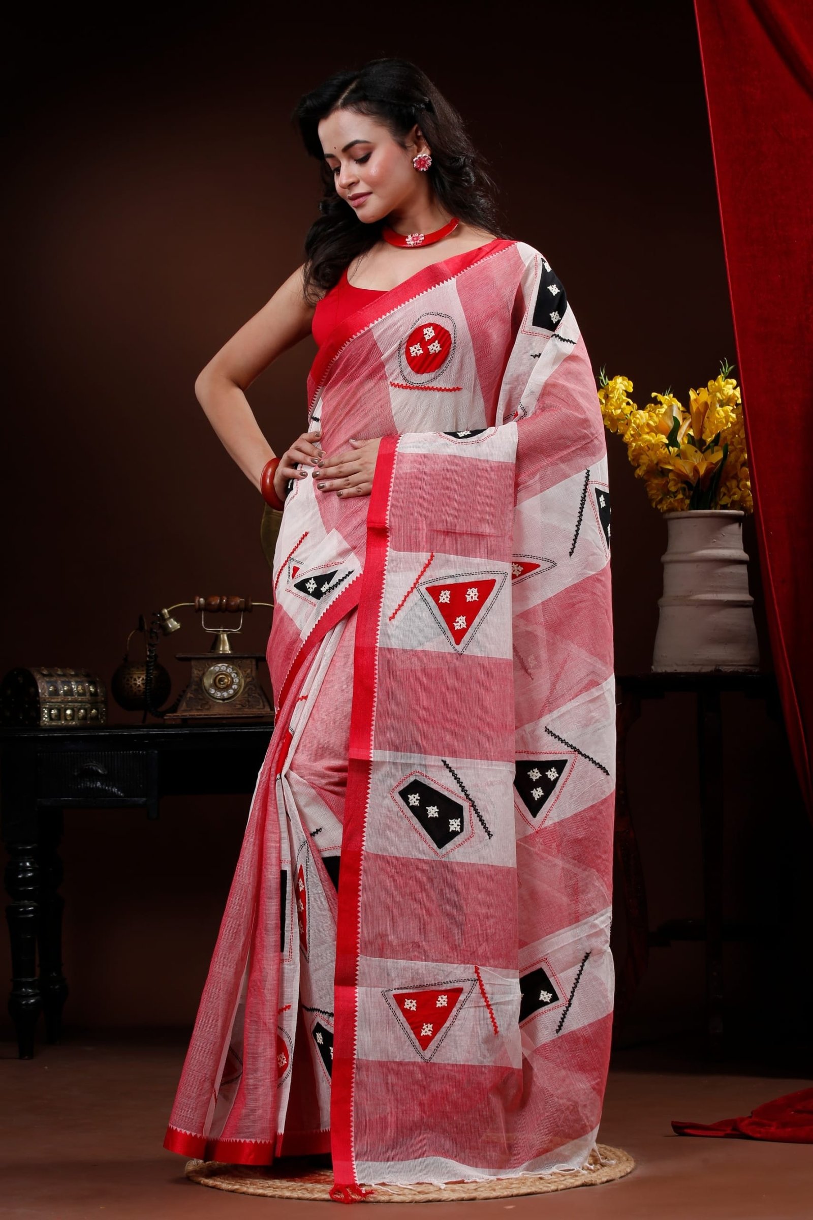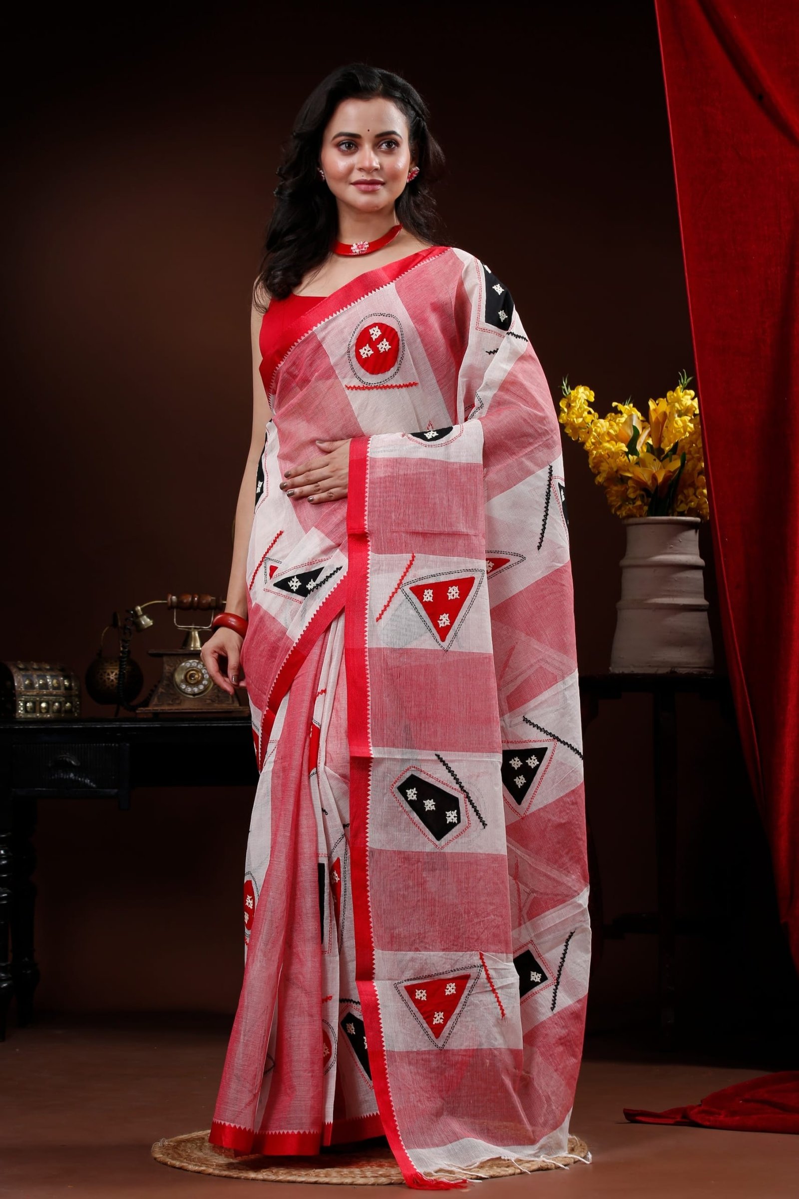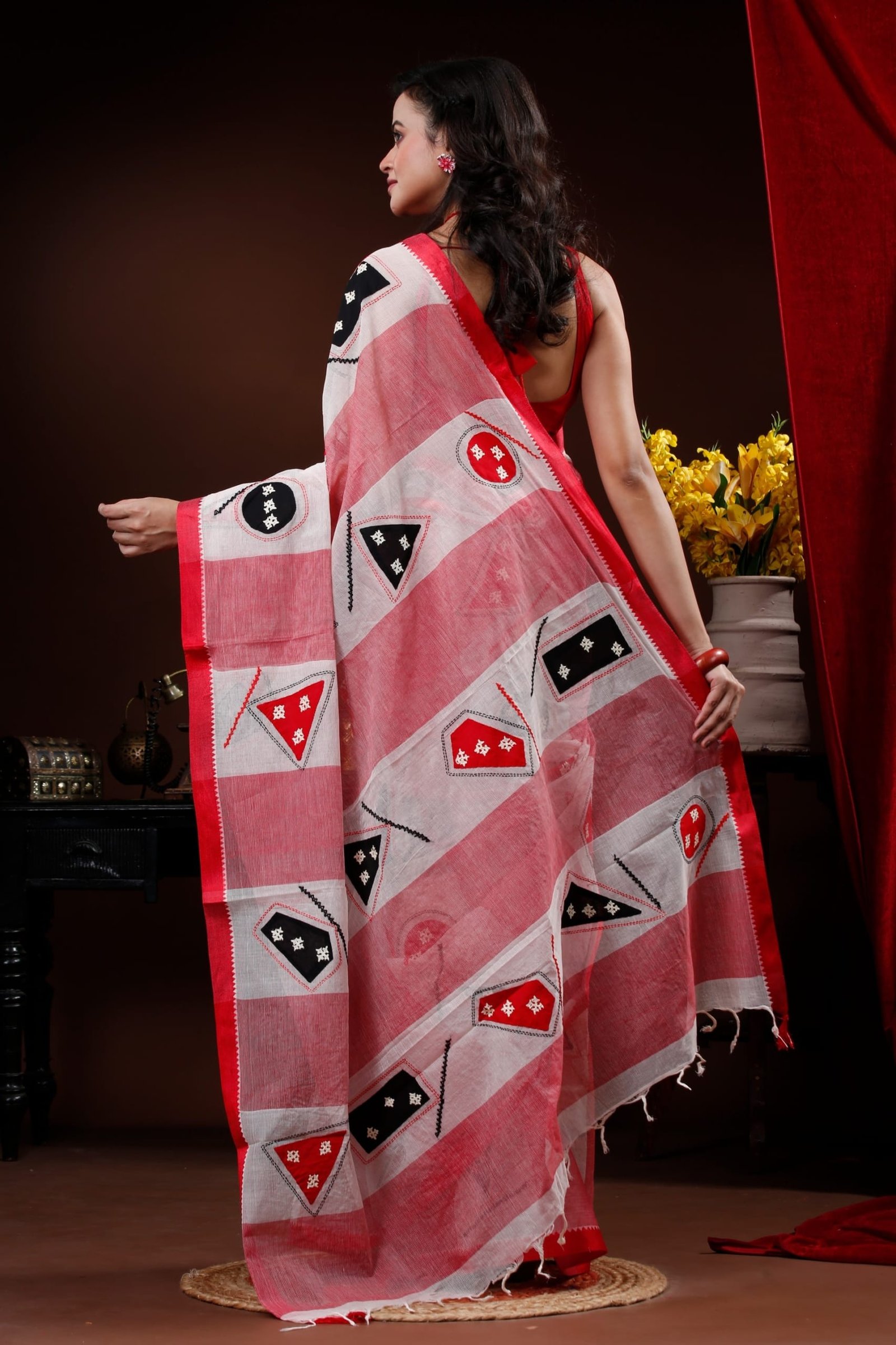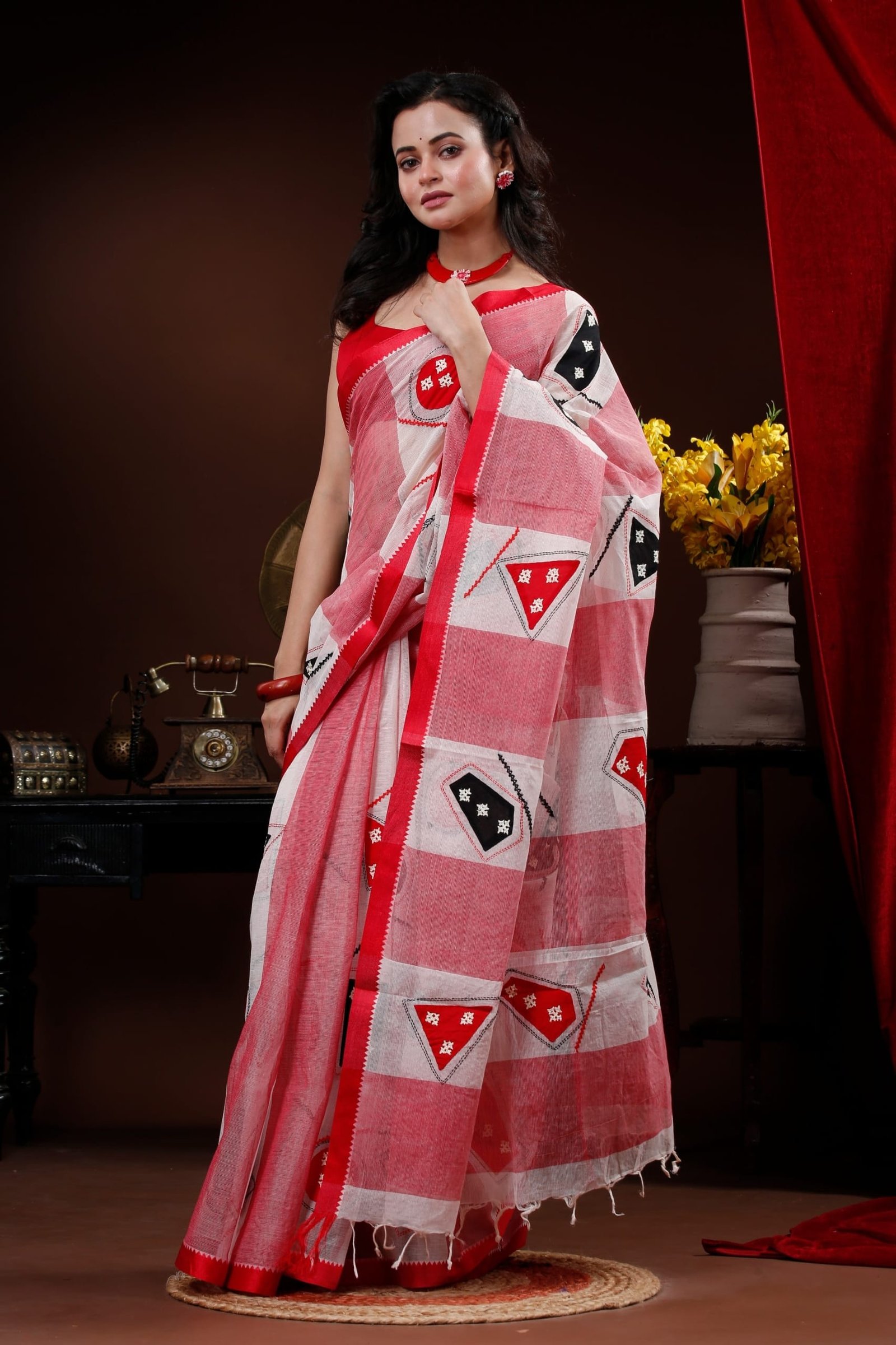 Red and white striped cotton saree with Gujrati ebroidered geometric motifs