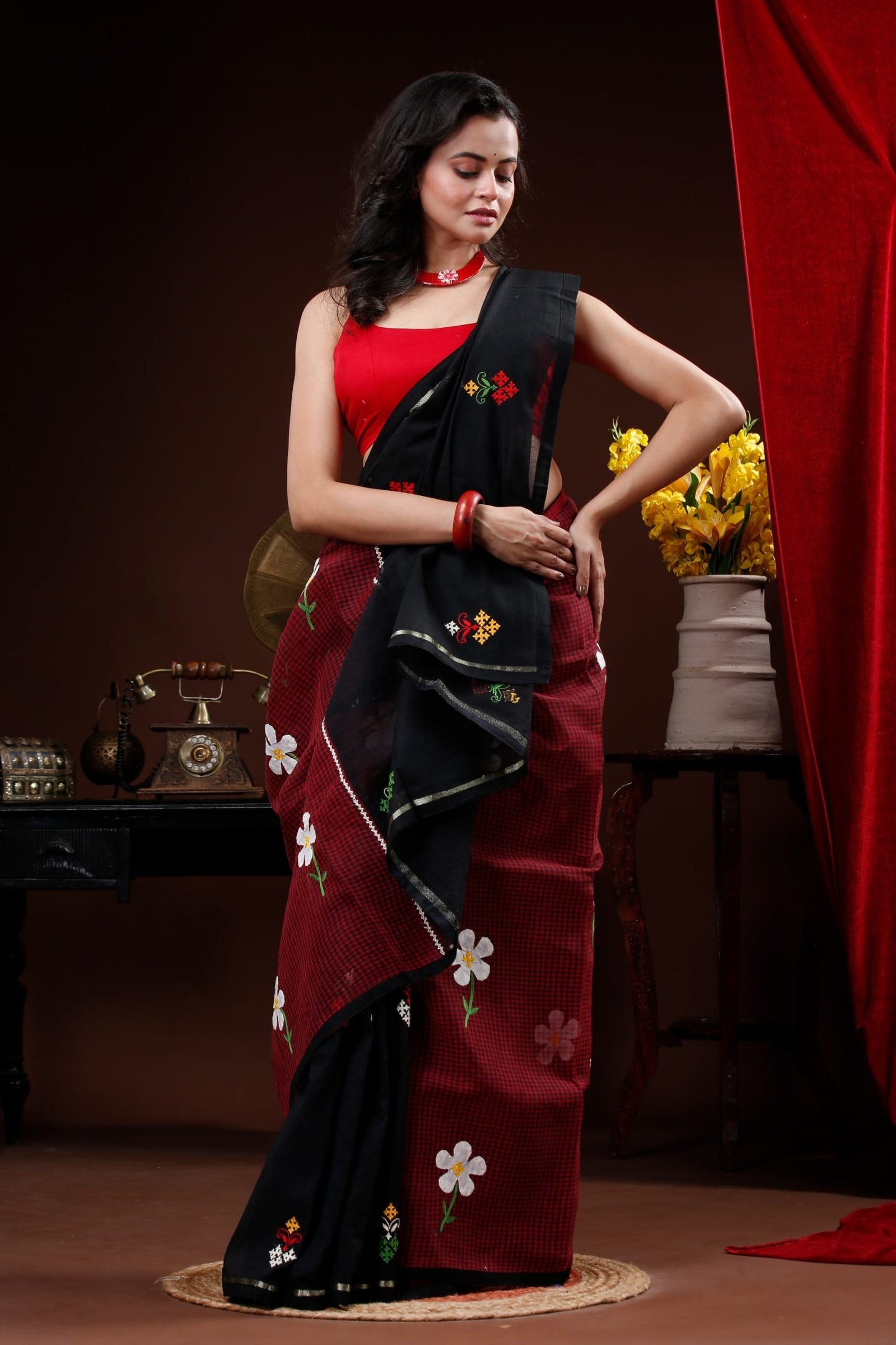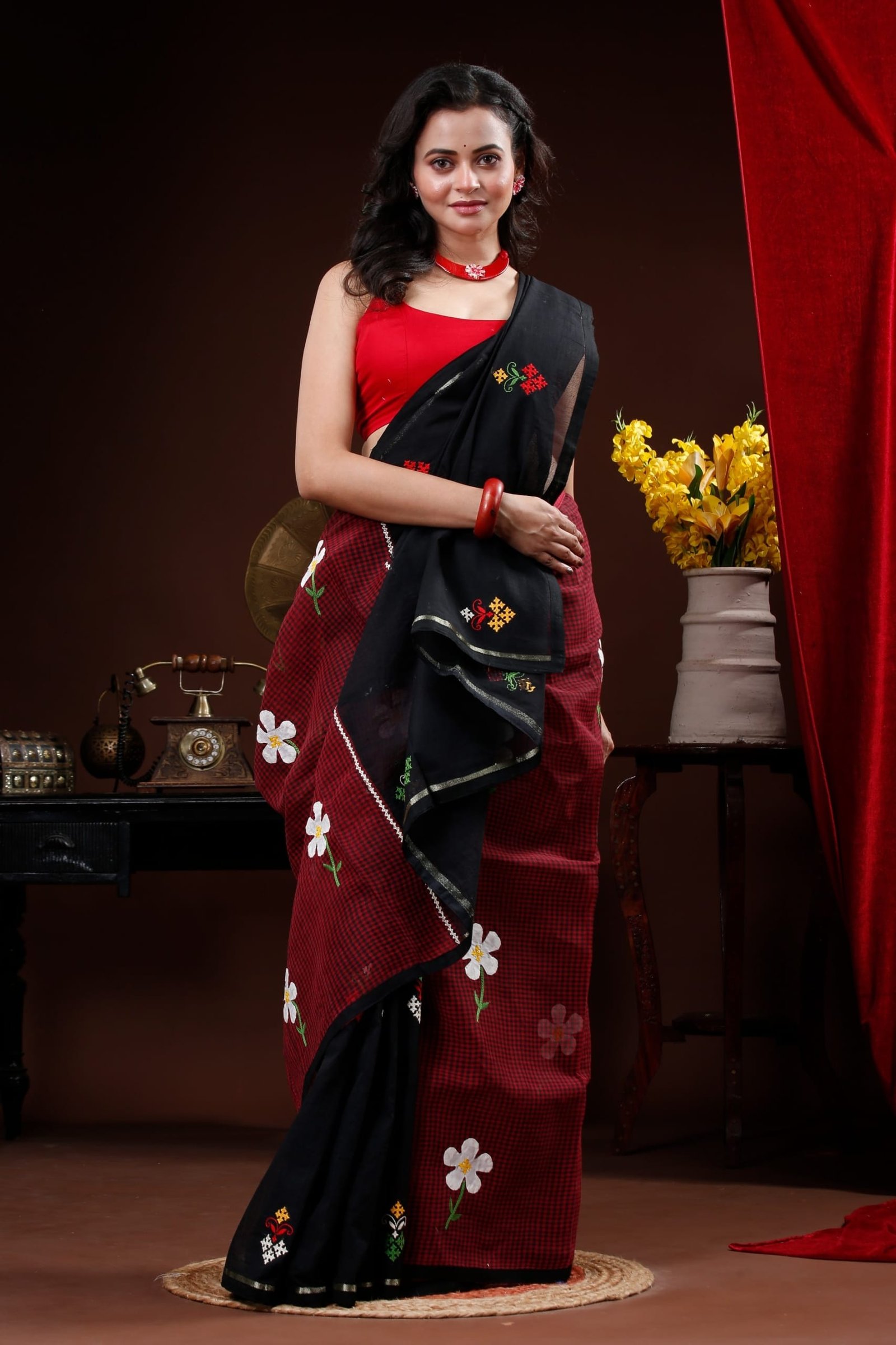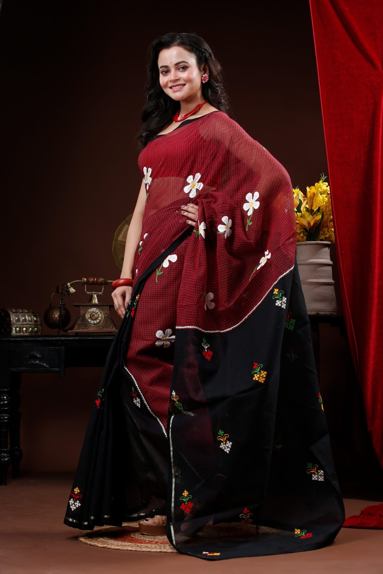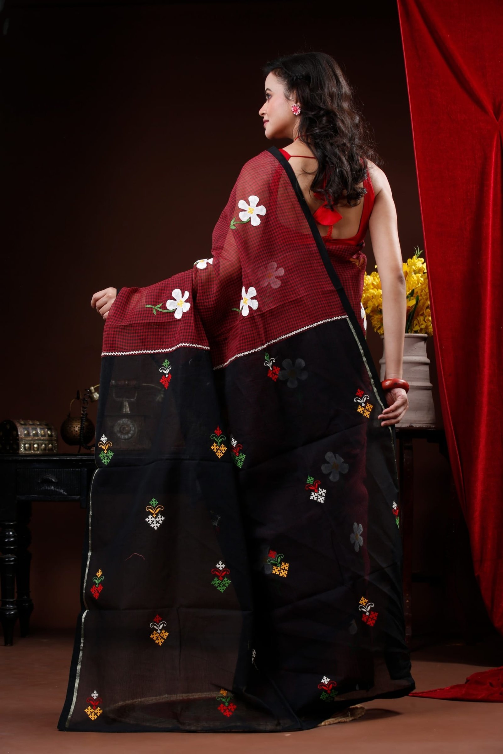 Maroon and Black mix and match cotton saree with floral applique and Gujrati Embroidery