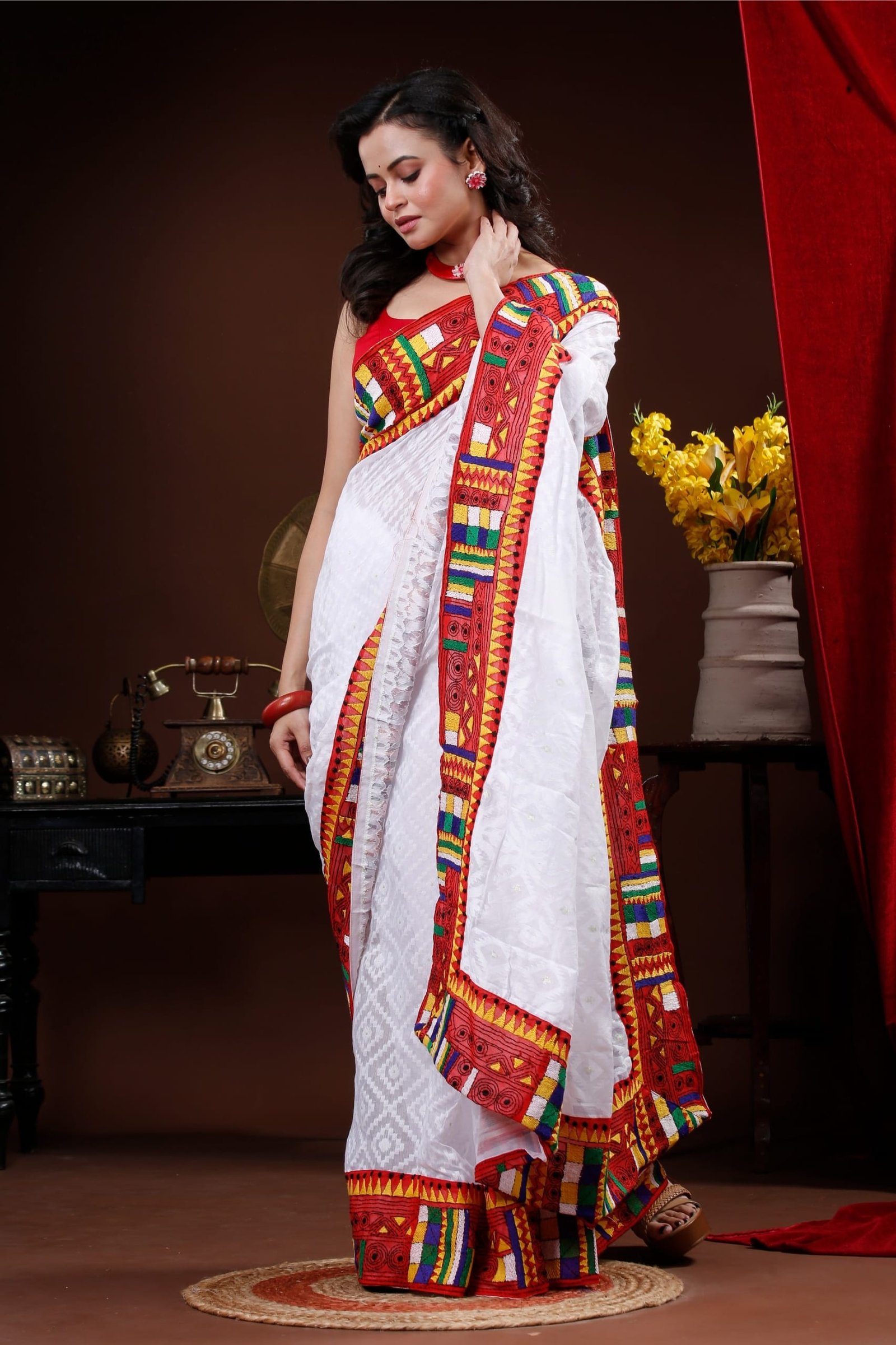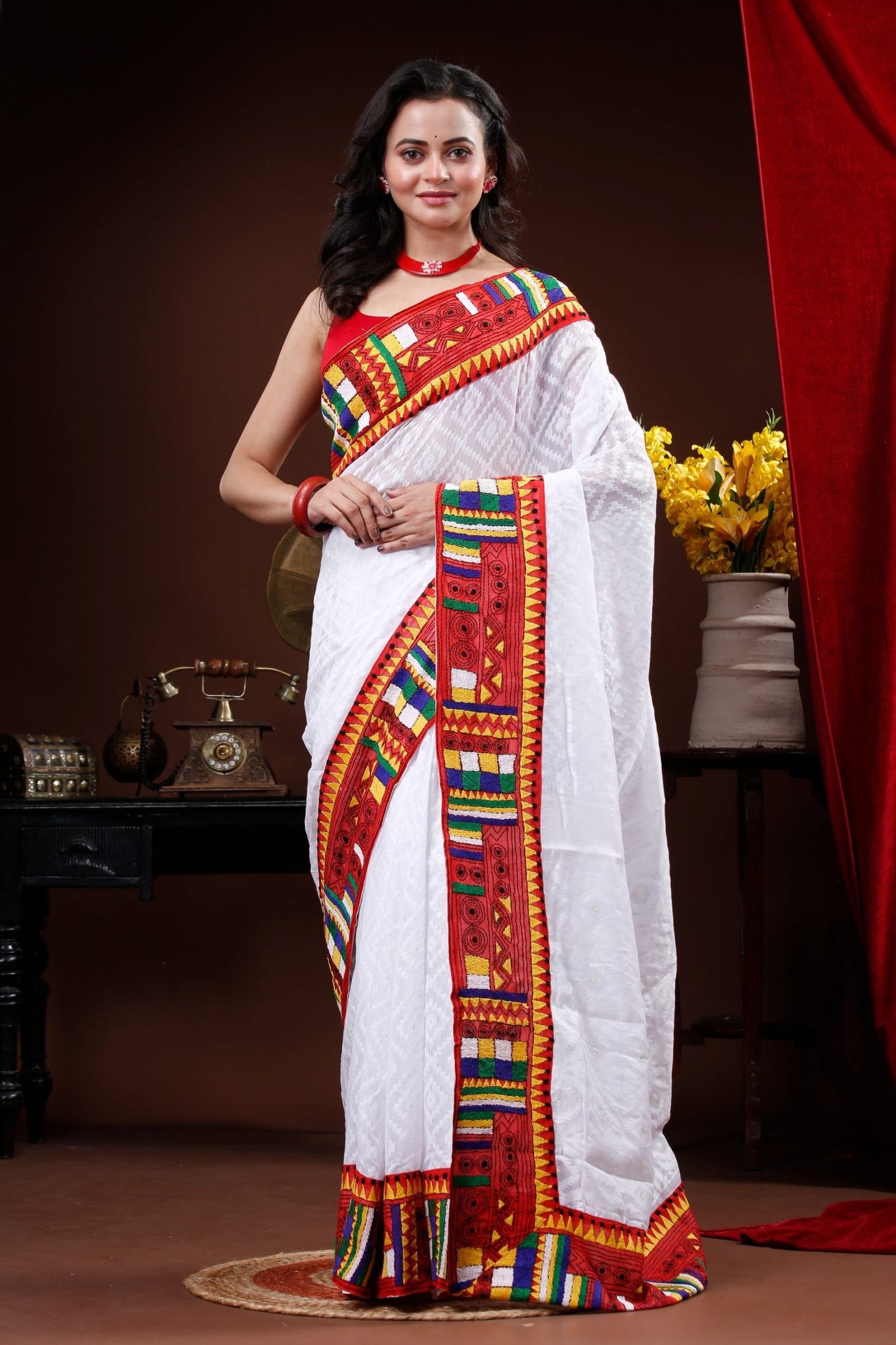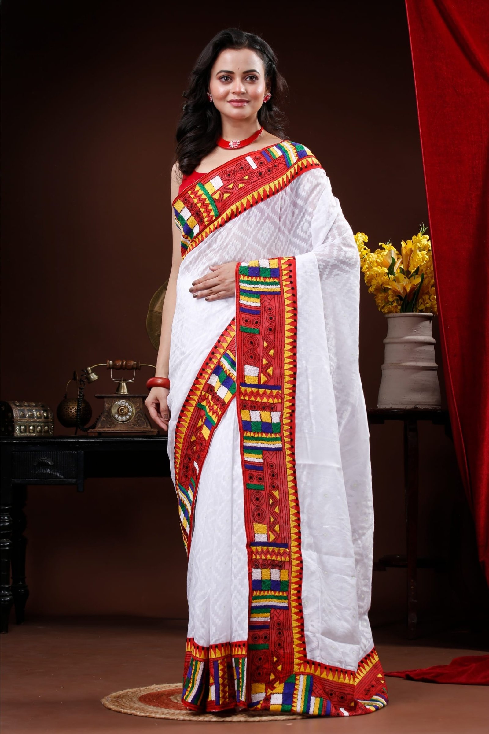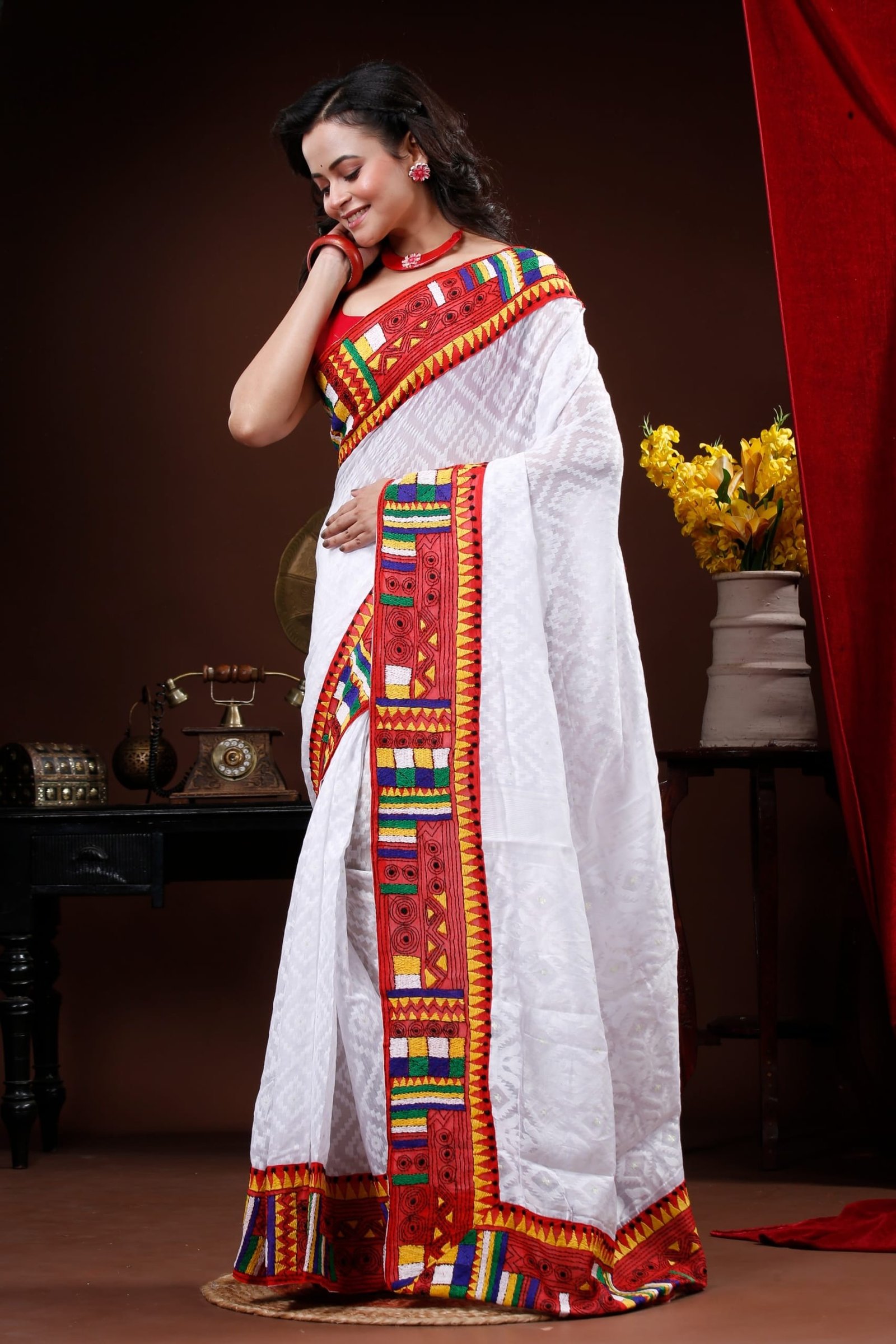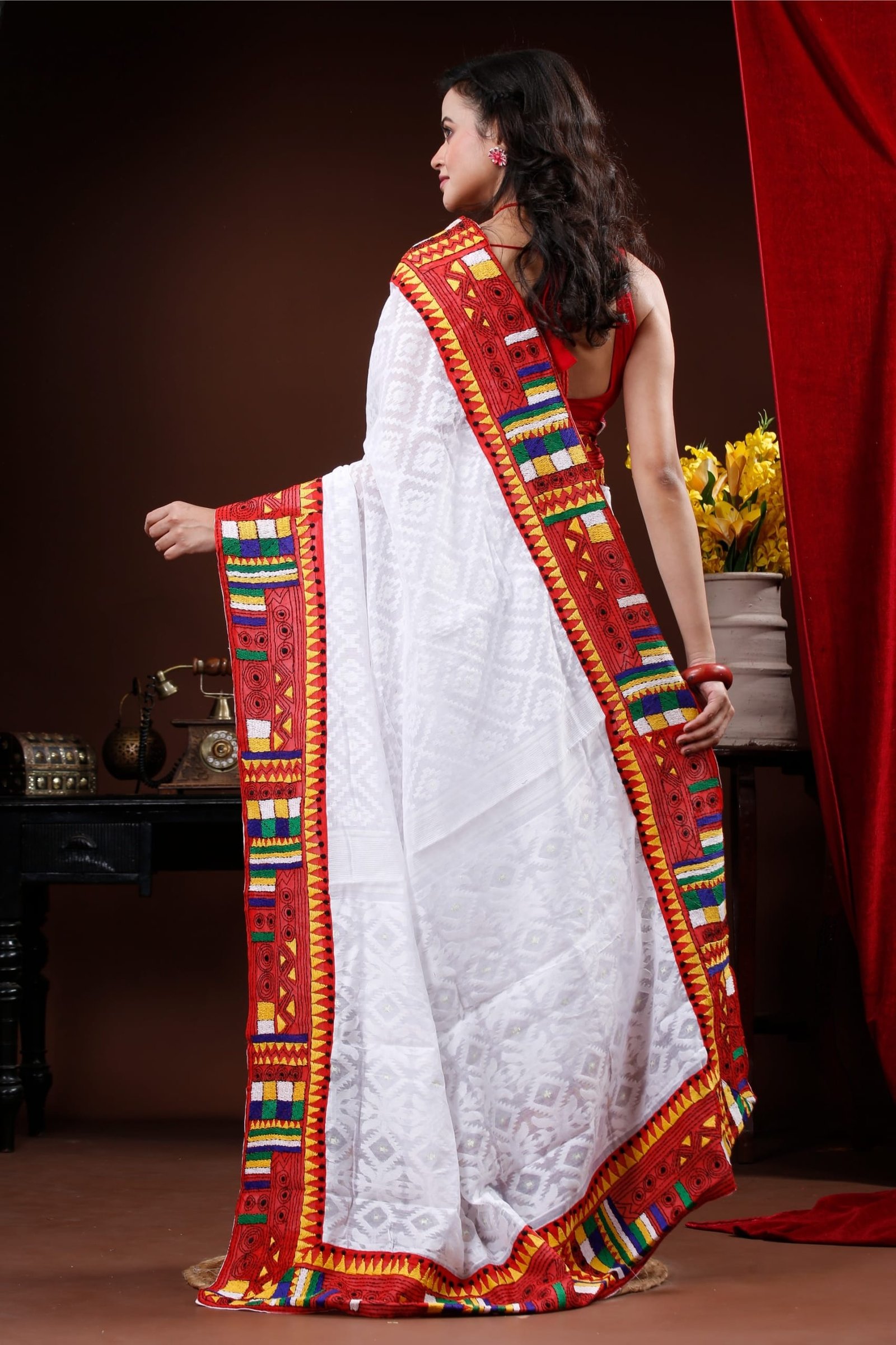 White Self patterned Dhakai saree with red geometric kantha border