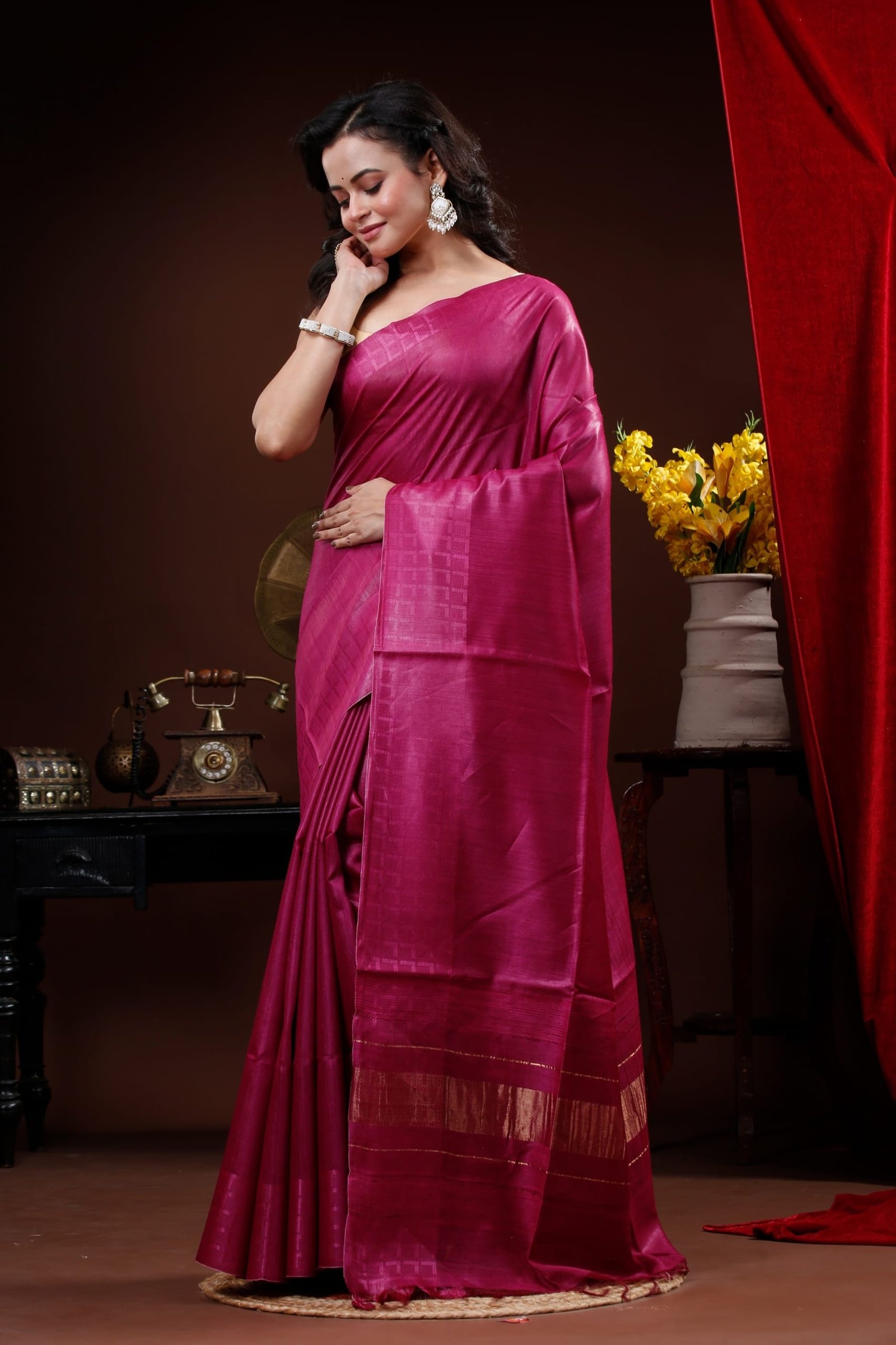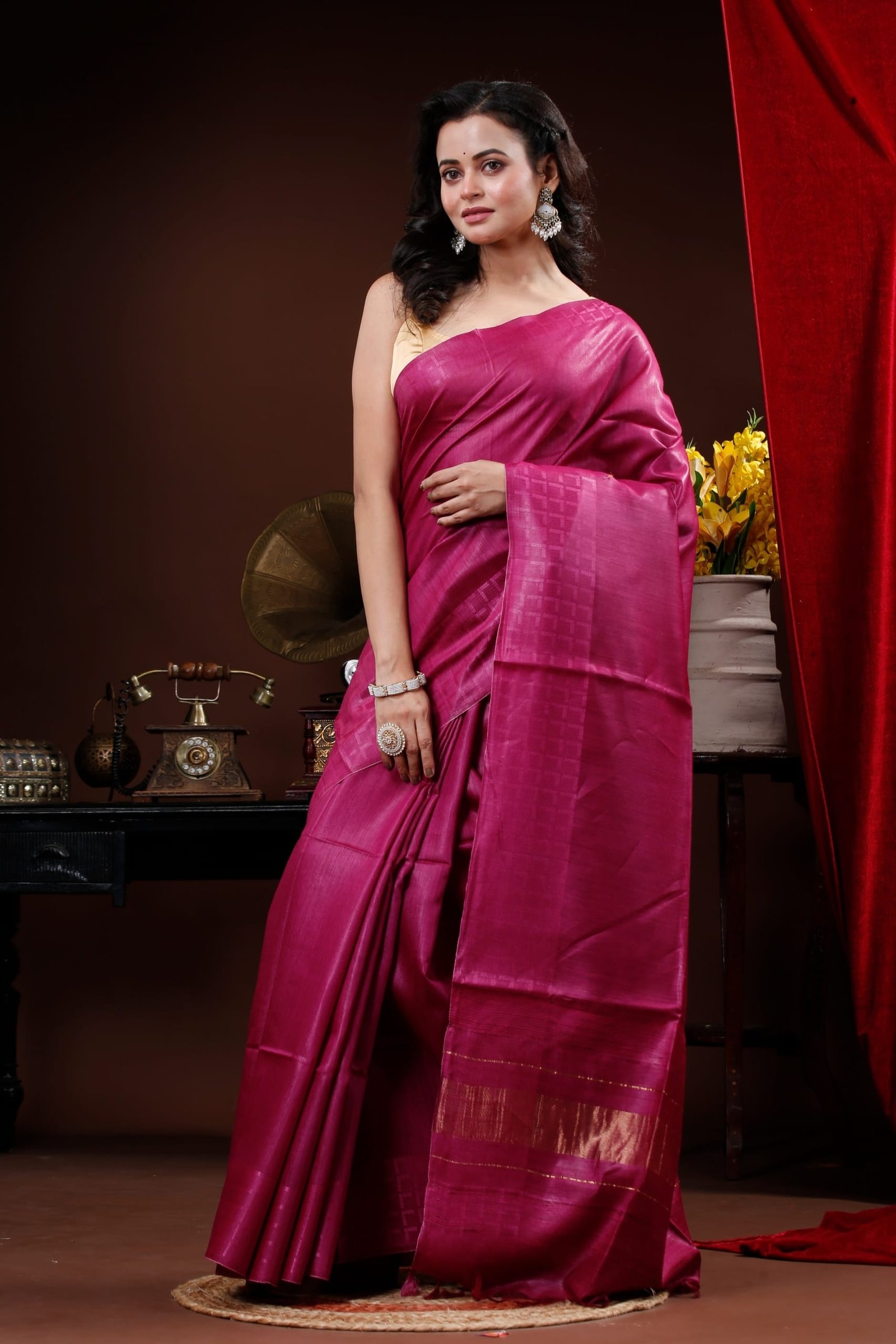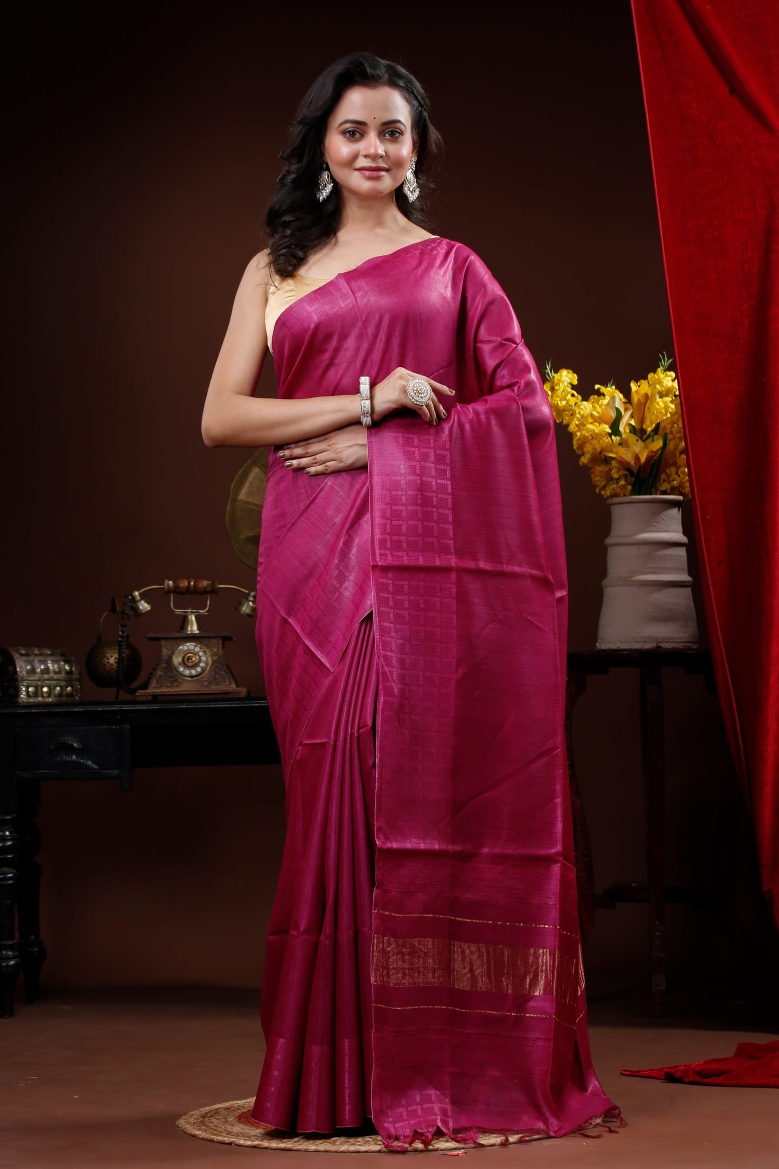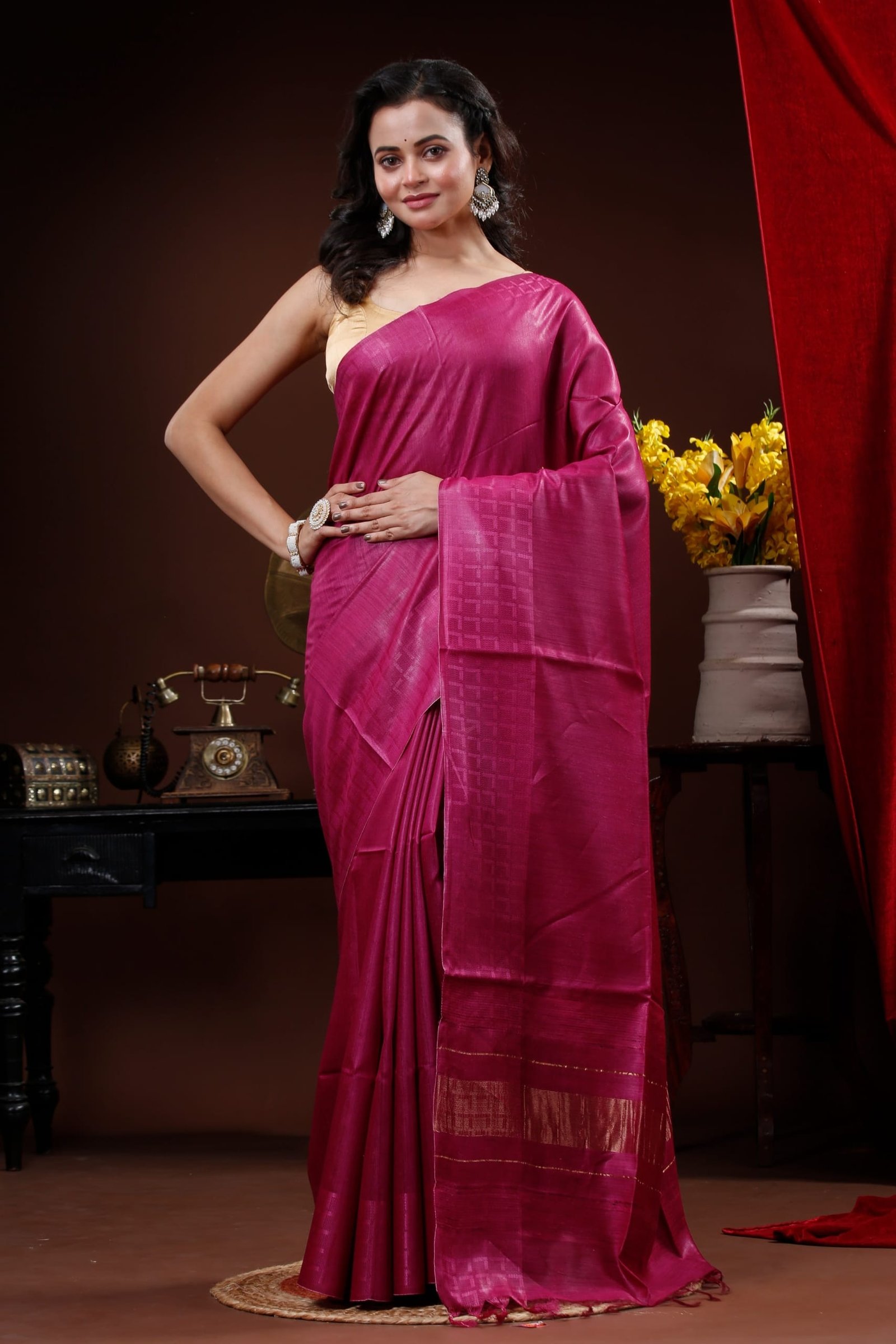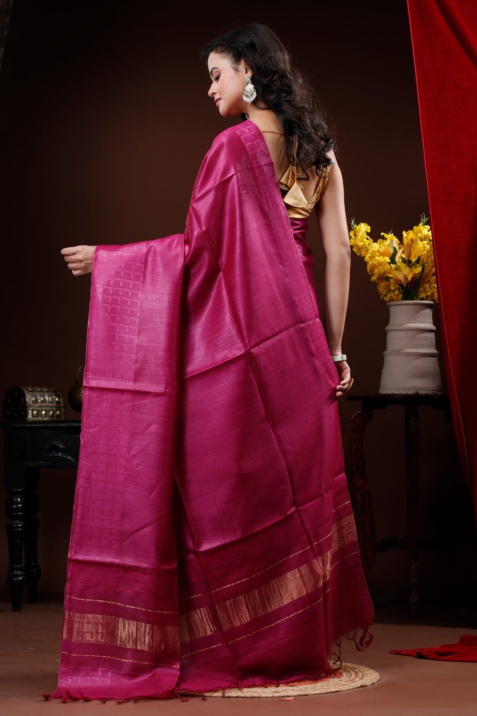 Rich Magenta colour Muga Tussar Saree featuring a subtle self pattern body with golden Zari Border in pallu