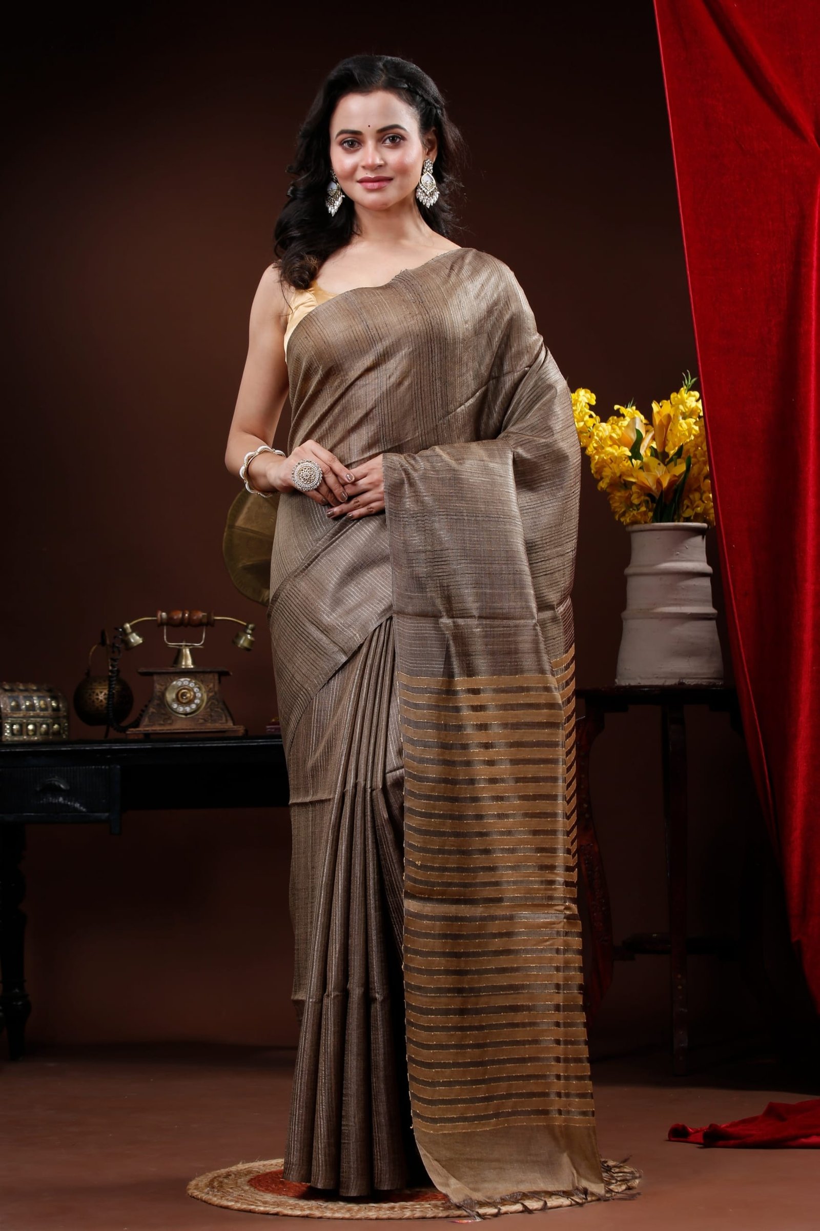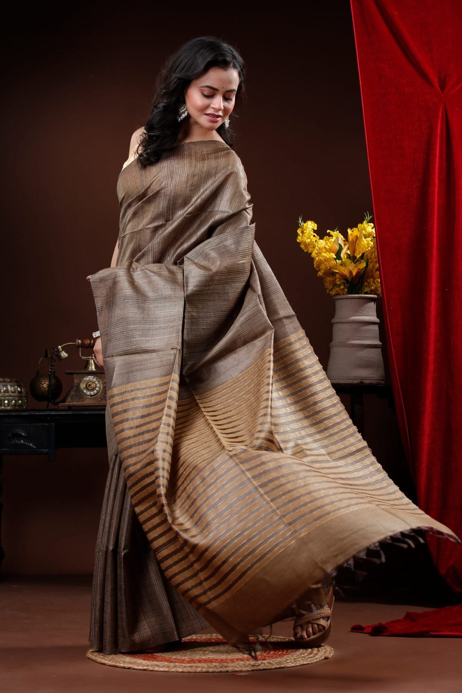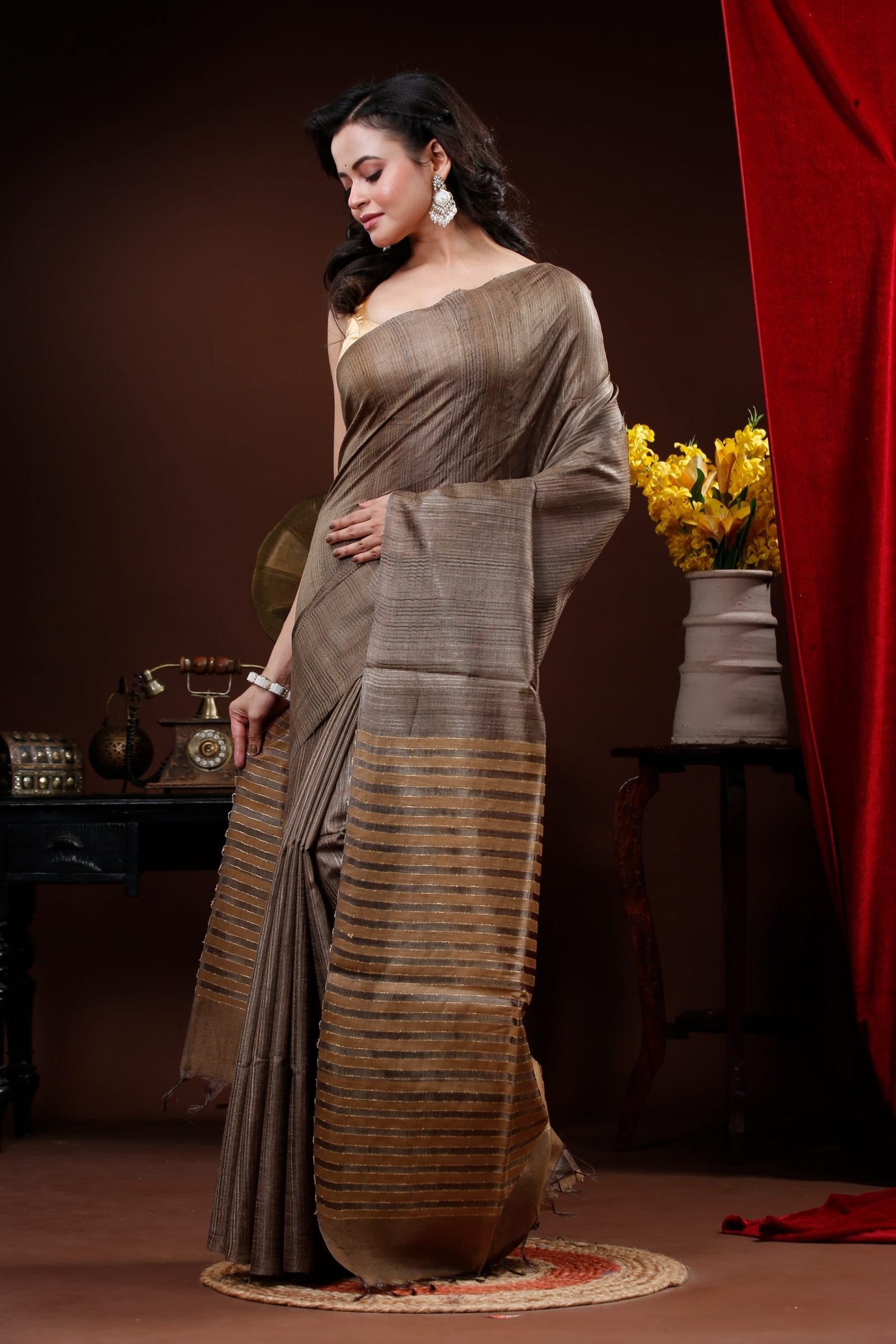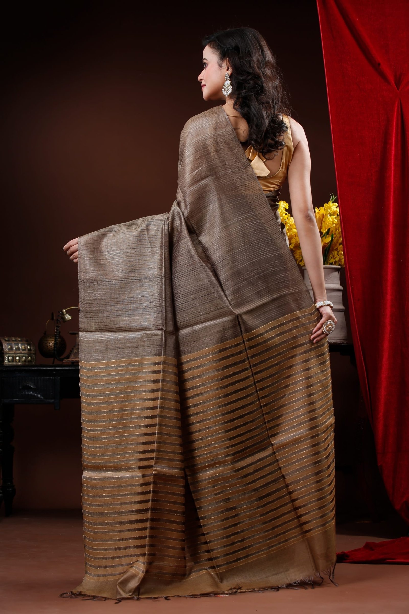 Rich metallic Bronze shade Tussar Gicha Saree with a finely textured body and pallu with horizantal golden stripes